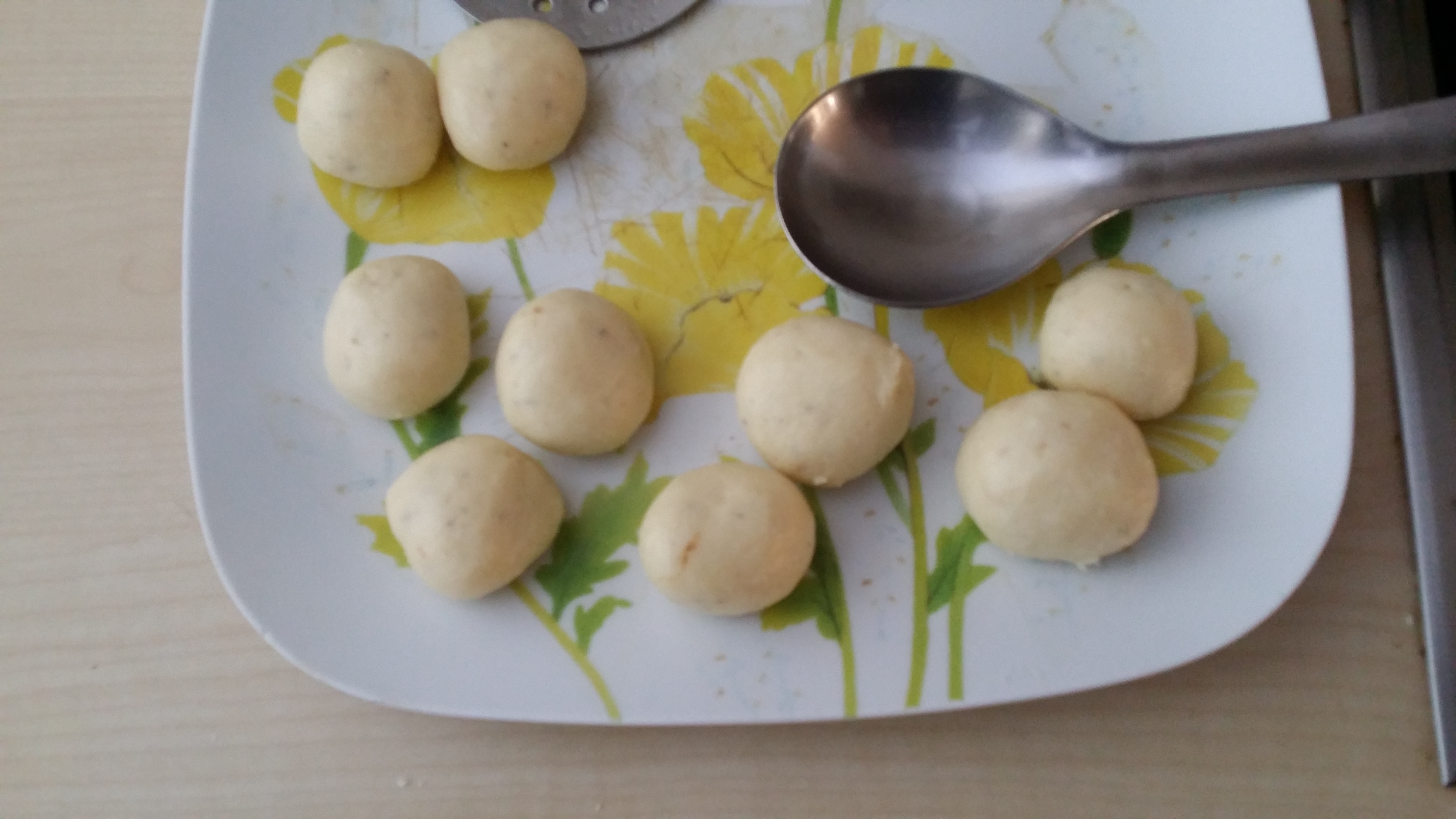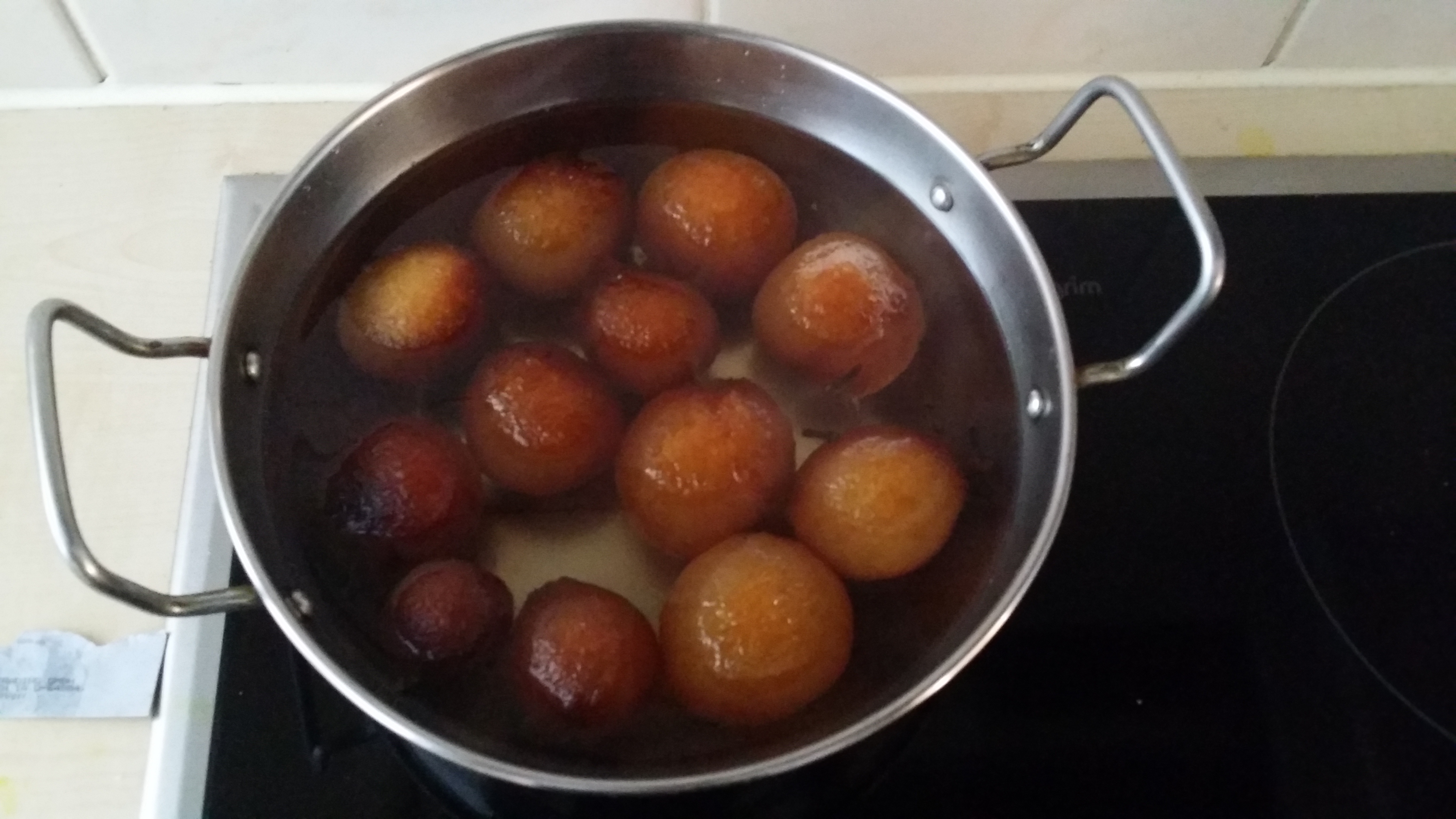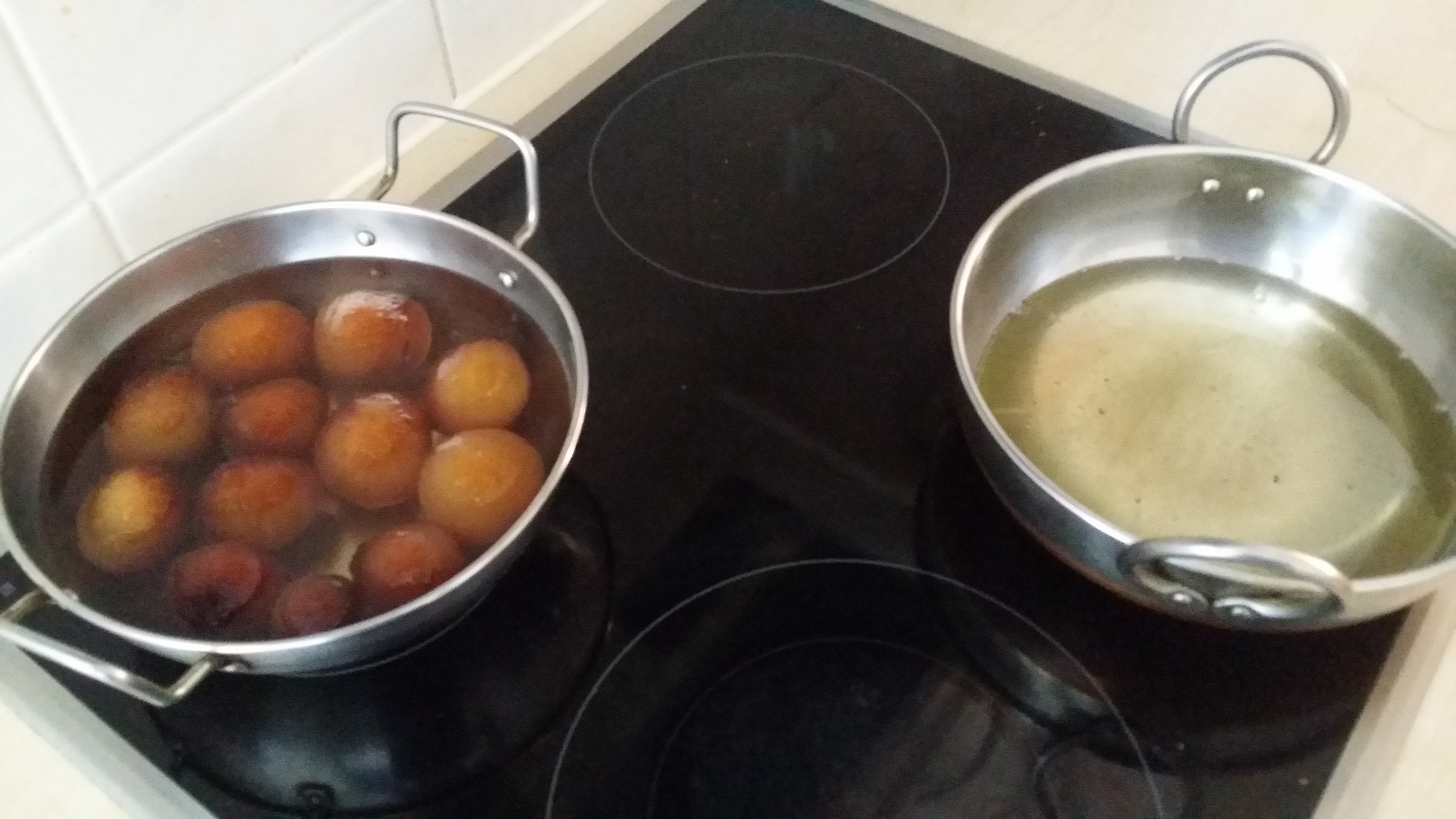 A friend of mine gave me the recipe to make from scratch. However as I was not able to locate evaporated milk and did not have any milk powder on hand, another friend kindly bought me a pre-mixed pack (Gits brand for 2.50 euros). So all I did was add full cream milk and powdered cardamom and kneaded the mixture. Once completed, I made balls for frying. A note to myself – make even smaller balls the next time as they will really expand from being fried and also by soaking in the sugar syrup.