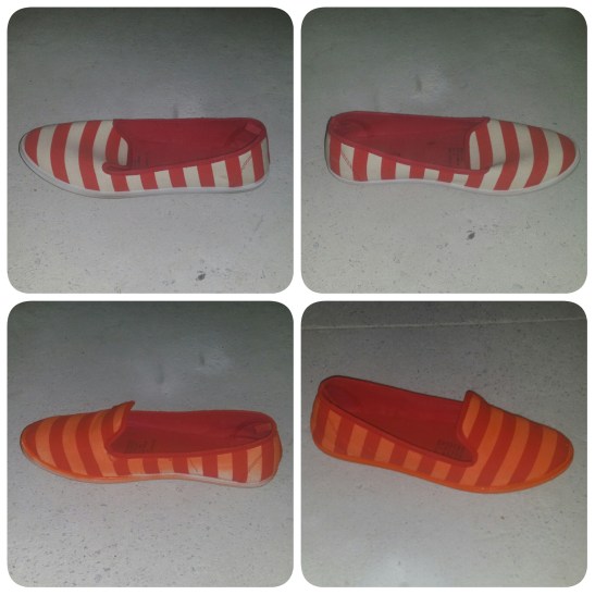 This project has been prolonged for at least a month. I finally got around to doing the second shoe yesterday :D. I sprayed one coat of orange spray paint to a very cheap pair of flats I bought from kmart. Didn’t do a thorough job with the bottom heel so I will probably will have to spray another coat or at least touch it up …