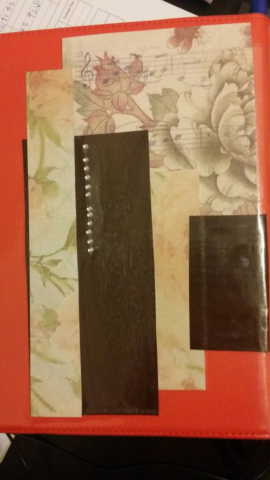Yes I know its crazy to think of baptising a diary but I enjoy using it more knowing that no one else will have exactly the same diary as me. So on Thursday night of last week, straight from work, I got this sudden burst of energy thinking of the idea and I got out my paper supplies and started cutting shapes and strips. In 40 minutes or so I was done and felt a sense of accomplishment… the results are as follows (it was a plain orange coloured diary to start off with):