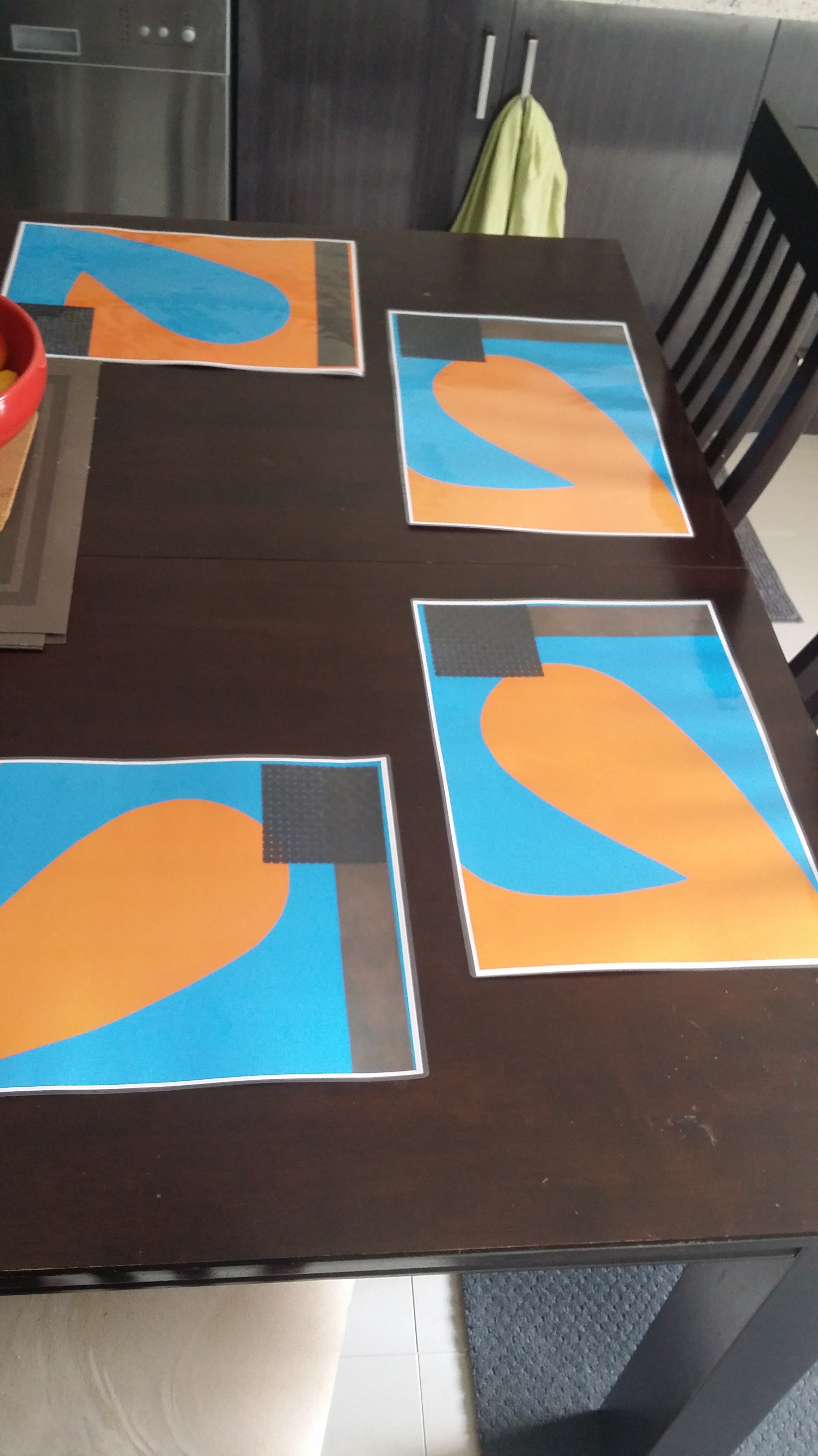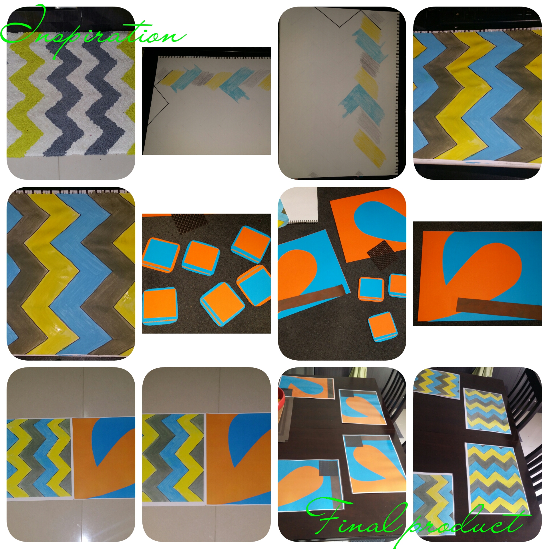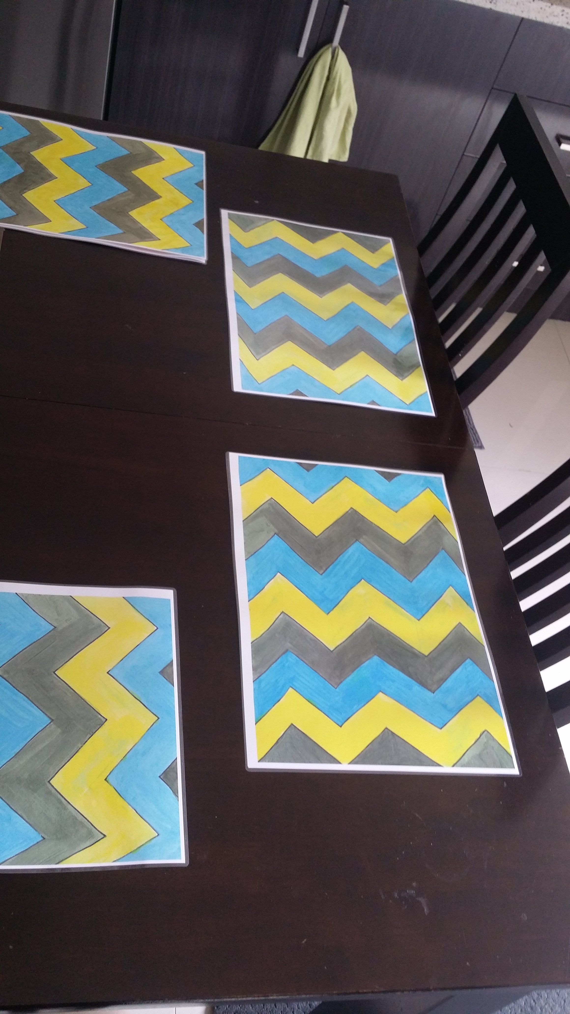 I started with drawing, then using colour pencils, then some painting. I then got some coloured paper and started creating designs. Then I moved on to creating coasters using the same colour scheme. I made the placemats double sided and I still like the blue and yellow side even though upon closer inpection, it does come across as a school art project!